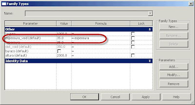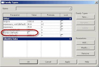 Vamos agora definir outro parâmetro, acedendo em Home a Family Types. Este será um parâmetro do tipo Yes/No; atribuir o nome buraco.